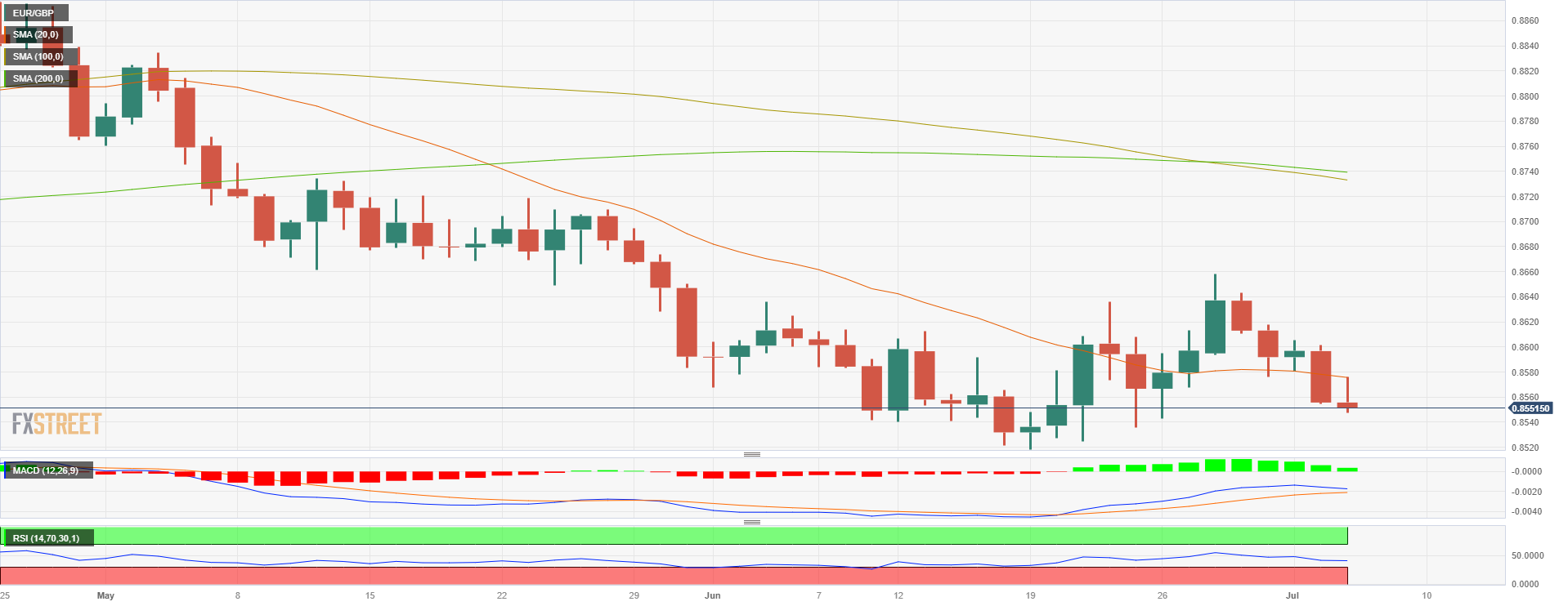 在欧洲服务业采购经理人指数(PMI)公布后,欧元/英镑抹去日内涨幅。该货币对最初触及位于高点0.8575的20日移动平均缐(SMA),但随后回撤至0.8550。德国、法国和西班牙汉堡商业银行(HCOB)服务业pmi令人失望的结果导致了走势逆转,而英国pmi与预期一致,处于扩张区间。