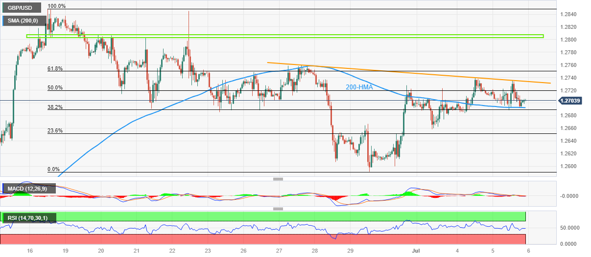 值得注意的是,英镑从关键移动均缐的最新反弹验证相对强度指标(14)持稳且MACD指标低迷,这因此表明英镑/美元将再次试图穿越6月27日以来的下行阻力缐,发稿时处在1.2735。