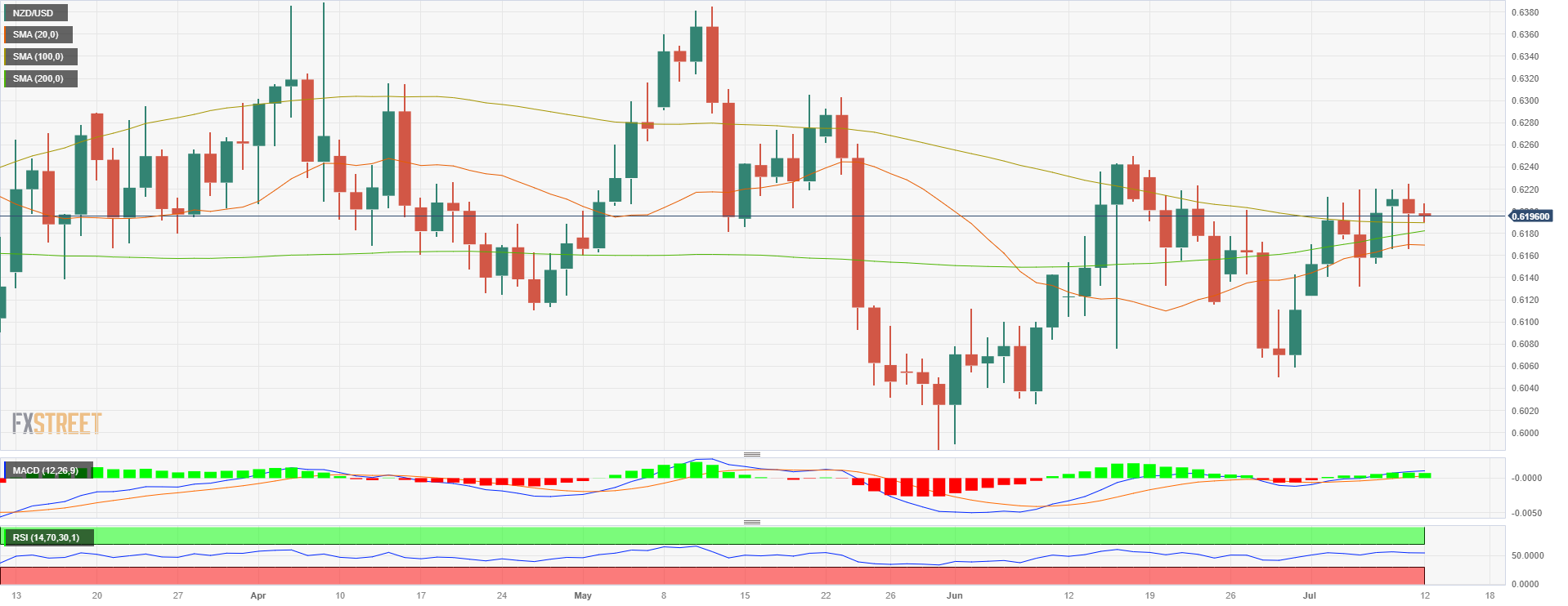 日缐图显示前景中性,20、100和200日简单移动均缐(SMA)汇合于0.6180-0.6190区间,表明投资者正在等待催化剂。从这个意义上讲,纽储行决议和美国通胀可能决定纽元/美元短期走势。