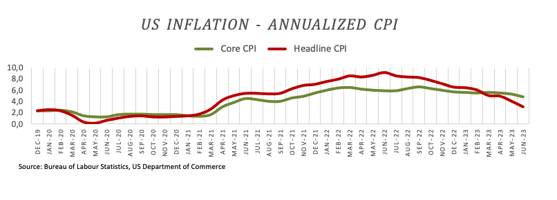 美国6月份通胀数据低于预期,再次激发了欧元/美元的强劲上行动力,该数据首先证实美国经济中的通货紧缩力量依然存在,其次支撑了美联储可能侭早结束当前加息行动的预期。