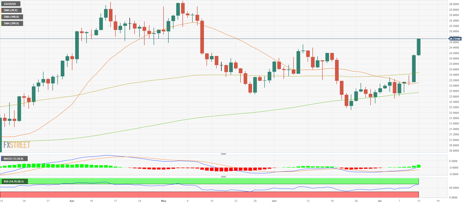 白银/美元连续第五天录得上涨,并跳升至5月中旬以来的最高水平24.70美元区域。从这个意义上说,在美国消费者物价指数(CPI)和生产者物价指数(PPI)数据疲软之后,投资者不再押注美联储(FED)在7月份后会再次加息,这使得美国收益率全面下滑。