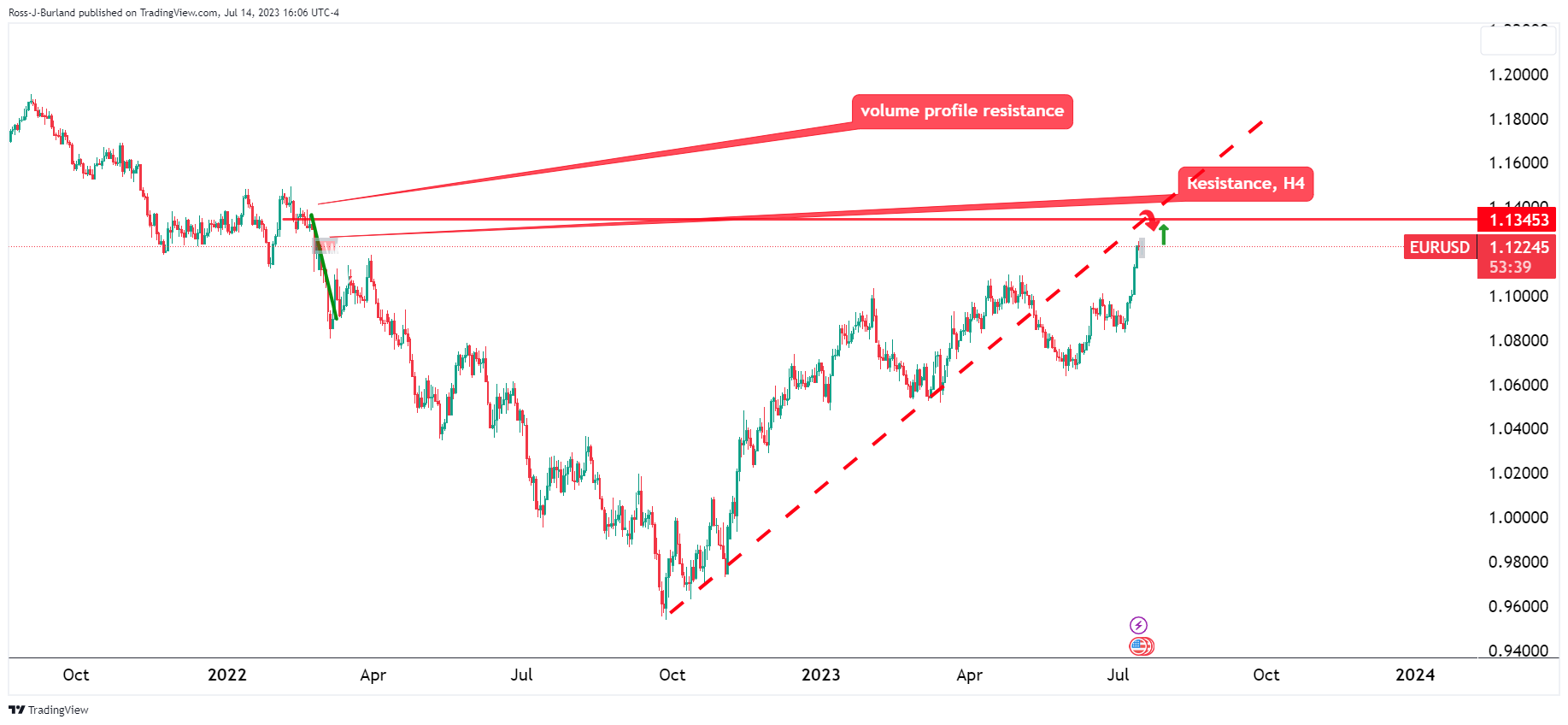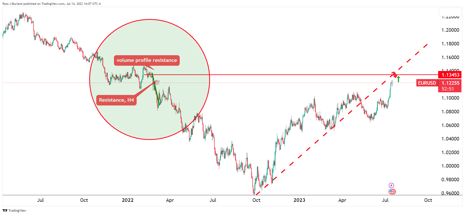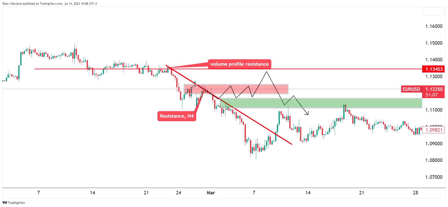 欧元/美元𧹒盘停滞,但不可否认仍维持潜在动能。然而,正如以下图表所示,看跌者正在计划布局。与此同时,美元整理反弹,因為市场在图表上明确了美联储在通胀疲软的情况下接近结束加息周期的预期。