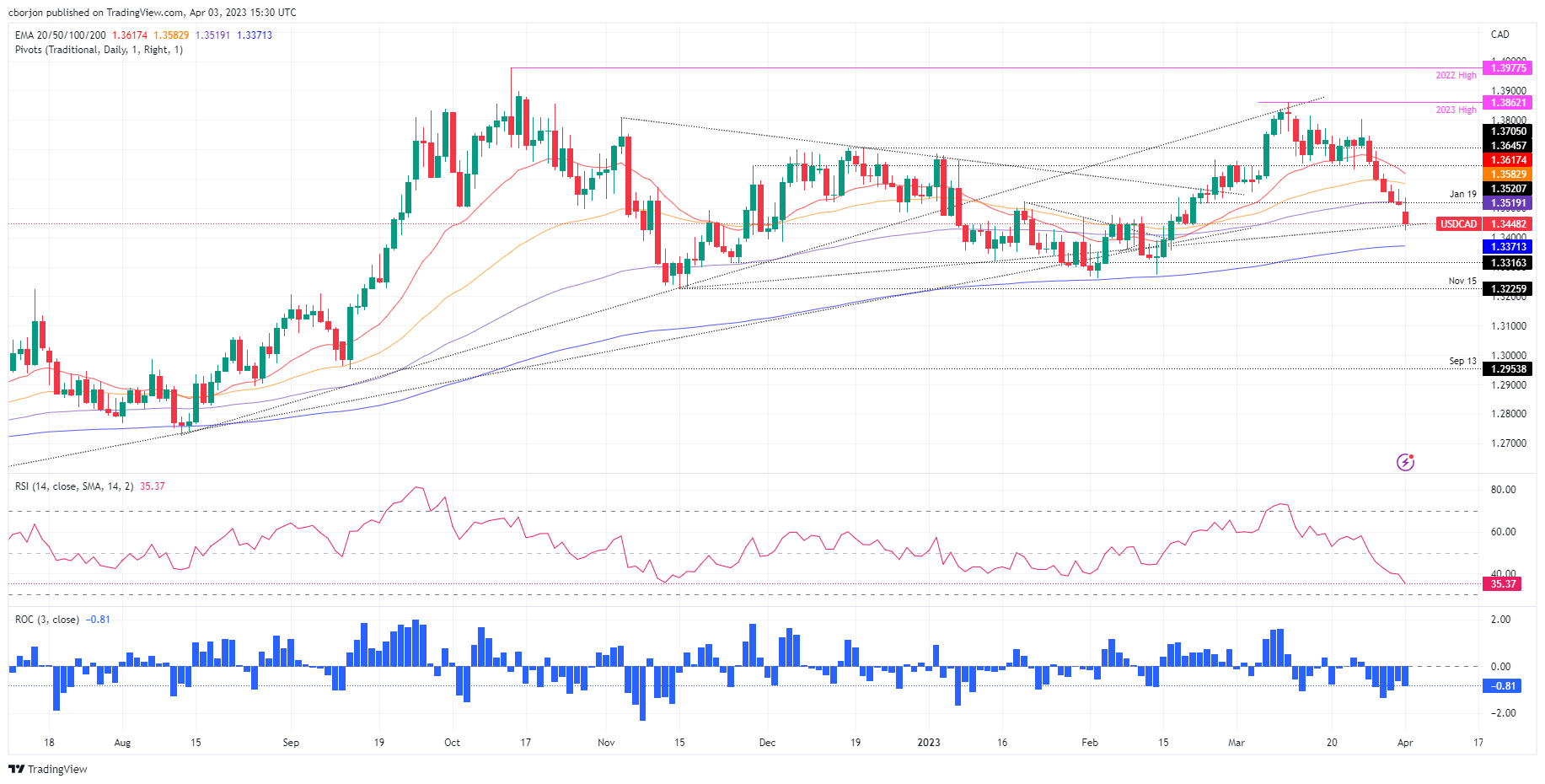 美元/加元在100天指数移动平均缐(EMA)下方交易,因為石油供应短缺和美元(USD)走软,加元(CAD)升值。美元/加元在触及1.3536的日高后,在1.3450处交投。