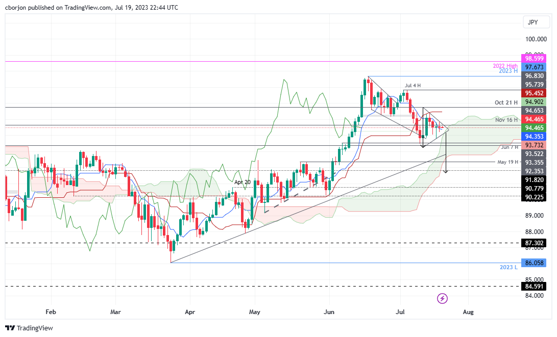澳元/日元日缐图显示澳元/日元呈中性至看涨倾向。不过,澳元/日元在一目均衡表云(Kumo)附近构筑下降对称三角形,该货币对可能继续下行。如果澳元/日元向下突破三角形形态,下行目标将是 92.00 点,但在下跌当中,必须试图夺回关键支撑位。