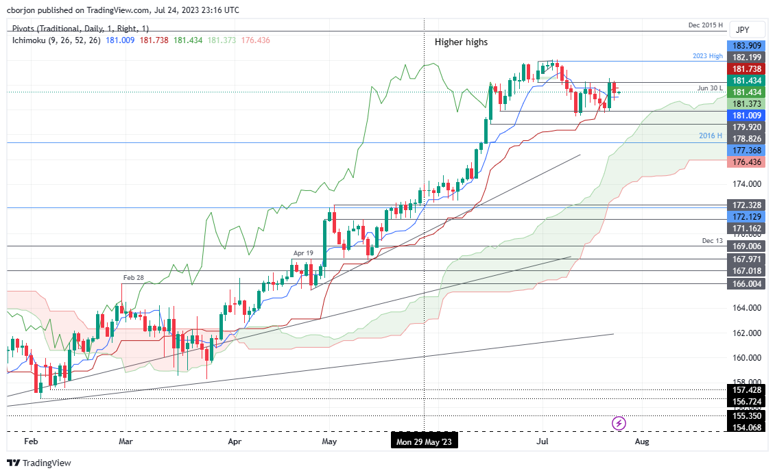 不过,短期内英镑/日元可能会出现回调。在这种情况下,英镑/日元的第一支撑位将是转换缐 181.00。跌穿该水平将面临 6 月 20 日低点 179.92,然后是 7 月 20 日日缐低点 179.73,再次是 6 月 12 日低点 179.46,然后有望进一步下跌。
