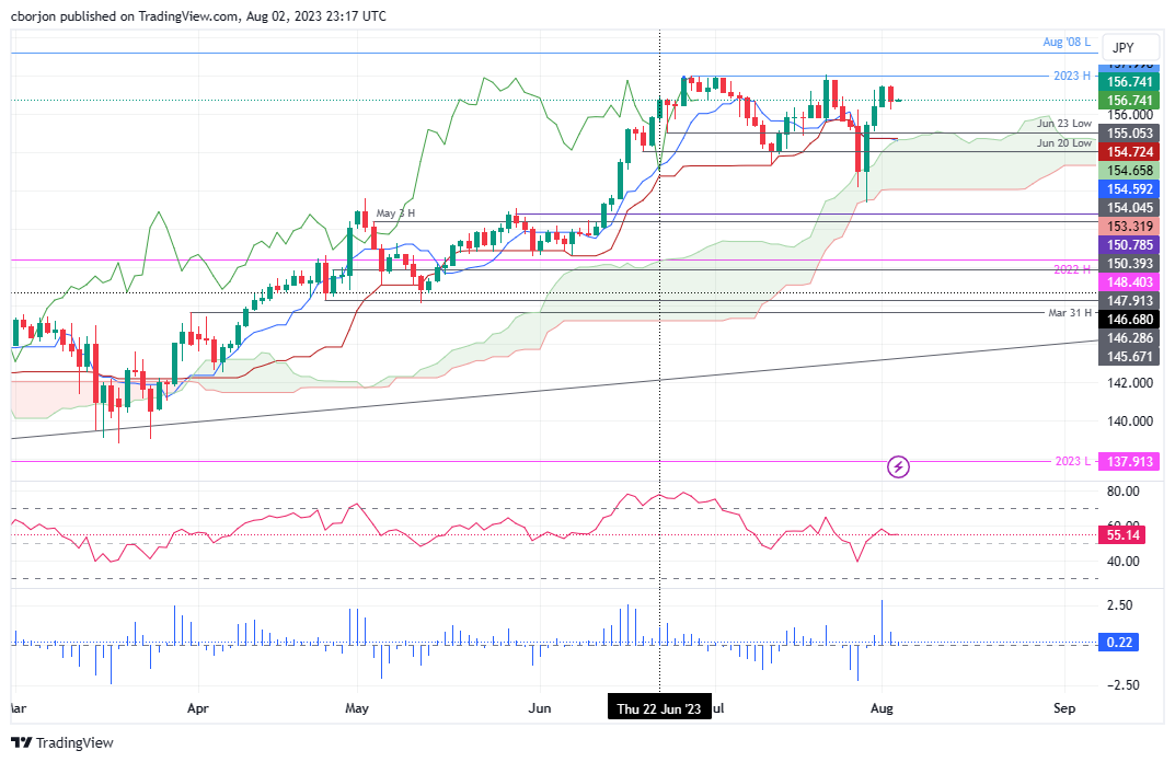 值得注意的是,转换缐位于基准缐下方,大约在一目均衡表云(Kumo)的顶部,即154.59/72附近,这是一个看跌信号。此外,先行带位于价格走势下方,表明空头可能在短期内重新控制局面。