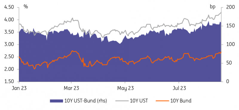 同样明显的是,最近美国国债收益率的上升是由美国造成的。美国国债与德国国债的利差扩大,说明美国国债正在推高德国国债的收益率。美国国债与日本国债之间的利差也是如此,这支持了我们的观点,即10年期日本国债上限的提高是一种辅助发展,而不是国债收益率上升背后的推动力量——尤其是在美国国债与日本国债之间的利差最近再次扩大的情况下。