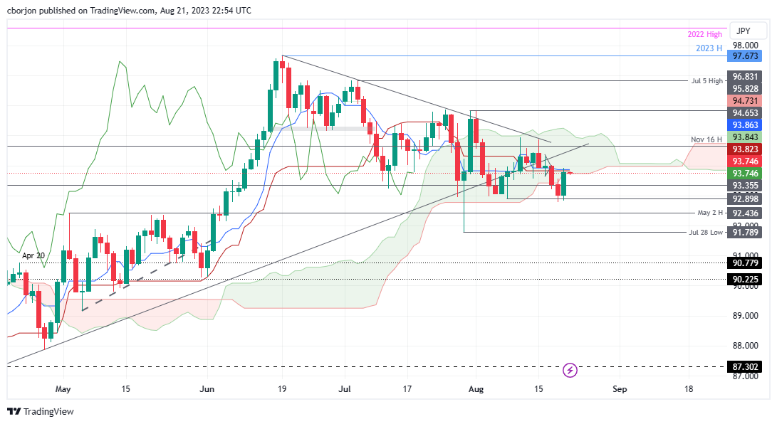 从技术角度看,除非澳元/日元突破技术阻力位,如基准缐和转换缐(分别位于93.86 93.82),否则澳元/日元仍将保持中性偏向下行的走势。一旦突破这些阻力位,下一个止损点将是 7 月 18 日高点 94.78,然后突破 一目均衡图云图顶部 95.00 附近的位置。