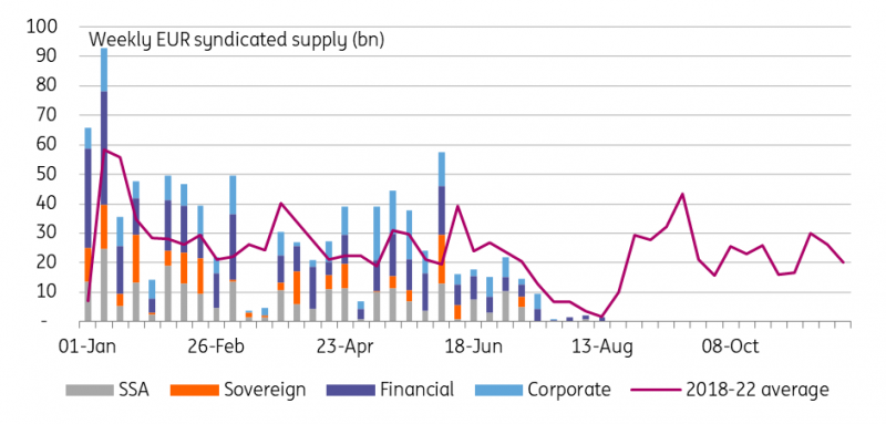 在欧元区,每周政府债券拍卖成交量可能在本周见底。在更广泛的市场中,谷底甚至可能已经过去,至少从过去几年的发行模式和已经在排队的新债券交易来看是这样。在政府债券方面,芬兰通常会在8月的最后一周发行新债券,结束夏季的沉寂。这一次,它标记了一个新的5年期债券。在超国家、次主权和机构领域,德国复兴信贷银行(KFW)和荷兰国家银行(BNG)昨日授权进行交易,欧洲金融稳定机构(EFSF)上周為一项即将进行的交易发出了征求意见稿(RFP)。