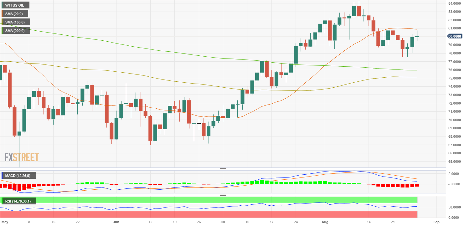 - 在攀升至 80.80 美元附近的日高点后,WTI 原油交投于 80.00 美元附近。