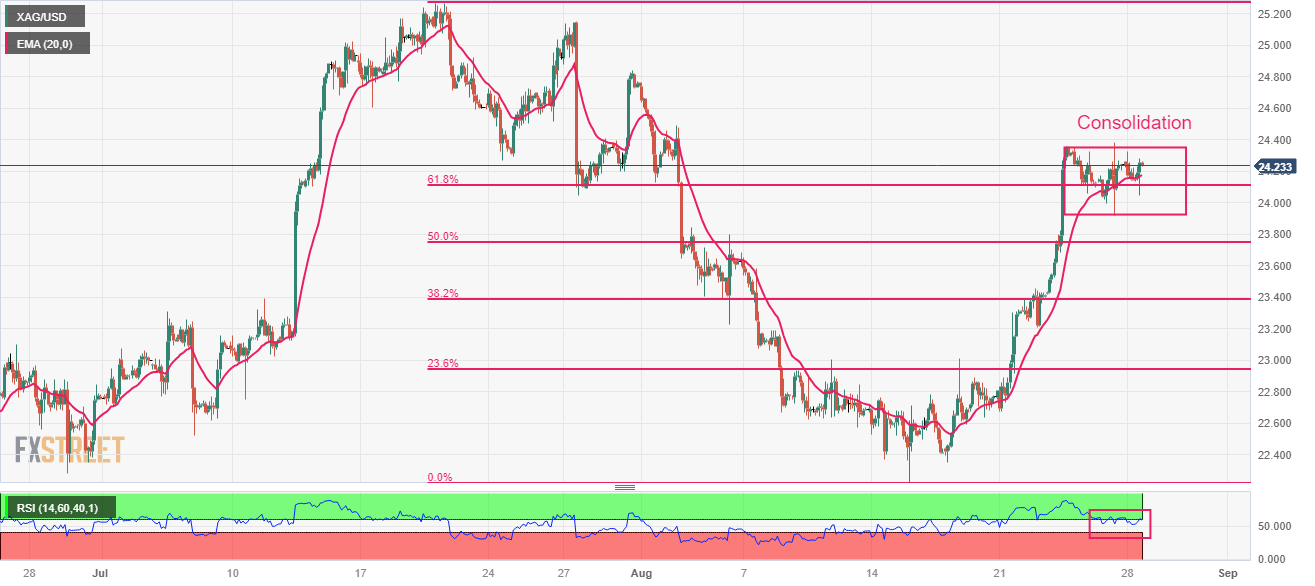 在过去四个交易日中,银价(XAG/USD)一直在 24.00 美元上方窄幅波动。侭管美联储(FED)主席杰罗姆-鲍威尔(Jerome Powell)周五在杰克逊霍尔研讨会上发表了鹰派评论,但白银仍在努力寻找方向。